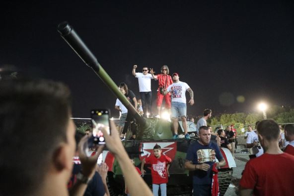 Puna "Marakana" čeka večeras Ligu šampiona... Navijači crveno-belih su pred meč sa Jang bojsima prvo otišli do tenka, nove atrakcije ispred stadiona, potom su slušali trubače, pa ušli da bodre svoje miljenike. Foto: MONDO/Stefan Stojanović