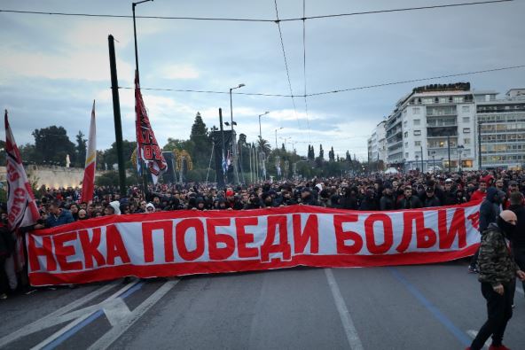 Scene uz Beograda sa početka grupne faze Lige šampiona, ponovljene su u Atini. Navijači Olimpijakosa i Crvene zvezde zajedno navijali.