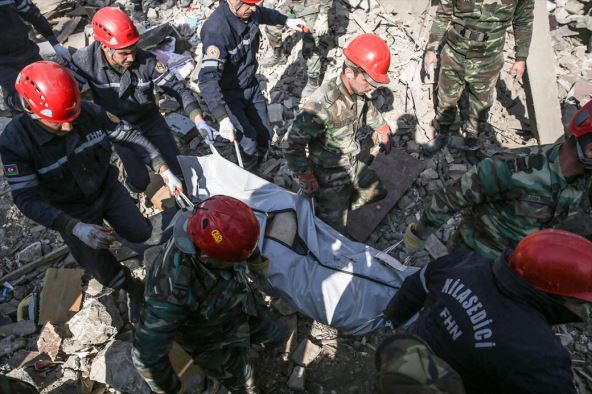 Jermenske snage od 27. septembra izvode napade na centar grada Tertera raketama velikog dometa. Oni koji su uspeli da napuste domove, kada su se vratili zatekli su samo ruševine i jezive prizore spasilaca koji vade beživotna tela dok tragaju za preživelima.