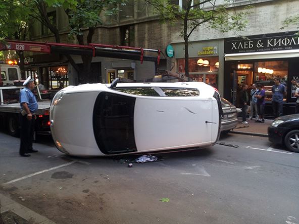 1/4Pogledaj fotogalerijuKako??? Kako prevrnuti automobil u jednosmernoj ulici u centru grada? Ne znamo, ali ovaj vozač je to uspeo. Foto: (MONDO)