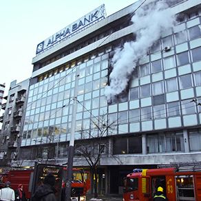 1/7Pogledaj fotogalerijuNa trećem spratu zgrade Dunav osiguranja u centru Beograda izbio je požar, koji se delimično proširio i na sprat iznad. Foto: MONDO - Petar Stojanović