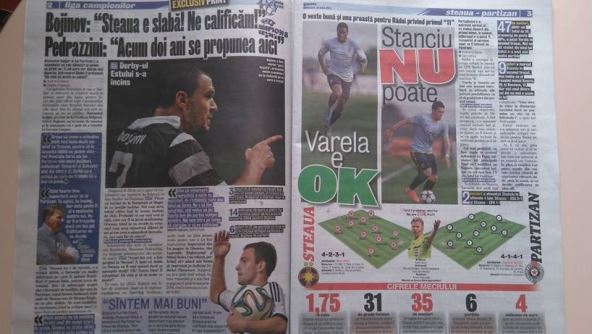Sportska štampa u Rumuniji veliku pažnju posvećuje duelu Steaue i Partizana u kvalifikacijama za Ligu šampiona. Prisećaju se prošlosti, ali dominira izjava Božinova: "Steaua je slaba! Neće se kvalifikovati"...
