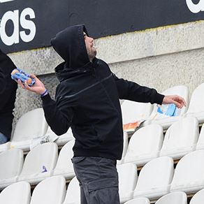 1/5Pogledaj fotogalerijuGrupa navijača Partizana na utakmici protiv Mladosti iz Lučana jajima gađala upravu kluba. Foto: MN Press