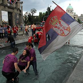 Kupanje maturanata četrnaeste beogradske gimnazije u fontani.