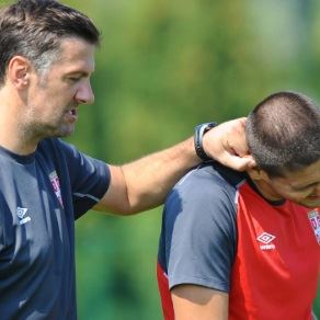 Dobra atmosfera na treningu fudbalske reprezentacije Srbije. Fotoreporteri MN Press-a "uhvatili" zanimljiv trenutak - Mladen Krstajić, pomoćnik u stručnom štabu, "vaspitava" napadača Aleksandra Mitrovića.