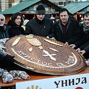 Uprkos velikoj zimi, Beograđani su se okupili na Trgu Republike kako bi izlomili božićne česnice koje su ovoga puta imale 200 kilograma i 11 novčića (3 zlatna i 8 srebrnih).