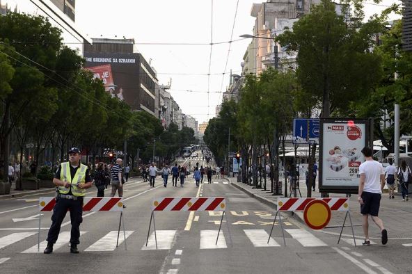 Saobraćaj će biti obustavljen u ulicama zone okupljanja: Trg Nikole Pašića, na delu od Terazija do Kneza Miloša, Dečanska, na delu od Terazijskog tunela do Trga Nikole Pašića, Bulevar kralja Aleksandra, na delu od Kneza Miloša do Beogradske (u oba smera) i od Ruzveltove do Beogradske (samo desna kolovozna traka), Beogradska, na delu od Ilije Garašanina do Bulevara kralja Aleksandra, Kneza Miloša, na delu od Takovske do Nemanjine (u oba smera), Takovska, na delu od Ulice 27. marta do Kneza Miloša (u oba smera) i Kralja Milana, na delu od Terazija do Trga Slavija (u oba smera).