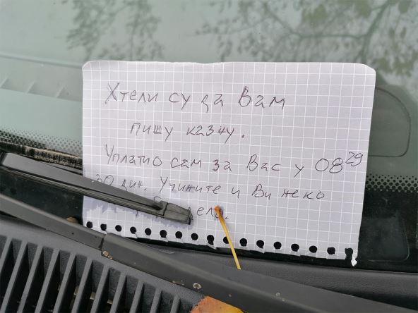 "Hteli su da Vam pišu kaznu. Uplatio sam za Vas u 08.29 časova 30 dinara", navodi se na cedulji ispod brisača i dodaje: