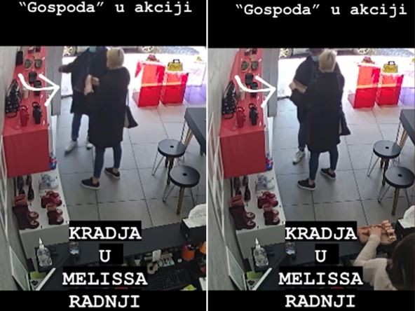 Na snimku se vidi kako kradljivci "razgledaju" stvari sa police, dok jedna osoba drži u rukama obuću, druga uzima torbicu i stavlja je ispod odeće koju je nosila.