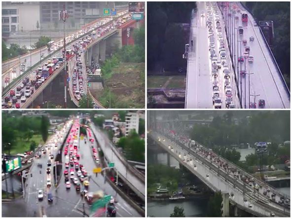 Jaki pljuskovi u kasnim popodnevnim satima zahvatili su glavni grad i izazvali potpuni saobraćajni kolaps u gradu. Gotovo da nema dela grada gde nema velikih saobraćajnih gužvi, a najkritičlnije je na beogradskim mostovima.