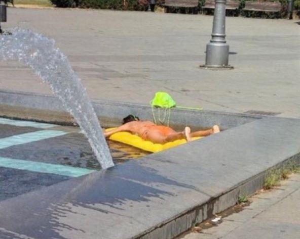 Sada je ponovo na društvenim mrežama osvanula nova fotografija jedne žene u kupaćem kostimu u istoj fontani, ali je ova odlučila da ponese i dušek na naduvanje kako bi što bolje mogla da se osunča i rashladi se istovremeno.