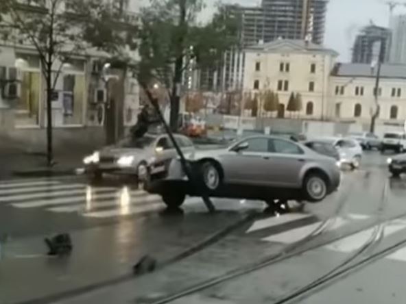 Na snimku se vidi kako se automobil "alfa romeo" popeo na stub semafora, te su dva točka u vazduhu.