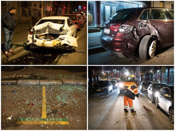 Šokirani očevici tvrde da se automobil kretao brzinom većom od 100 kilometara na sat. Oštećena su parkirana vozila "audi", dva "forda", "citroen", "škoda", "bmv" i "volvo". Nasred puta je rasuta srča, razbacani su i delovi automobila, a pričinjena šteta na vozilima je ogromna.