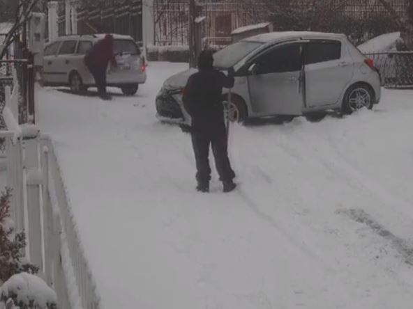 Na snimku se vidi kako jedan automobli proklizava na ledu, u jednom trenutku se zaustavlja i zaglavljuje u snegu.