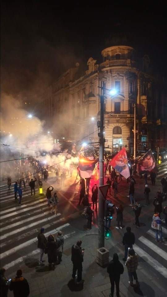 Skup je počeo himnama Srbije i Rusije, građani nose ruske i srpske zastave i uzvikuju "Rusija, Rusija", "Srbi i Rusi braća zauvek". Građani su uzvikujući parole Rusiji krenuli u šetnju do ruske ambasade, a kad su stigli ispred ruske ambasade su palili baklje i pevali "Srbija Rusija".