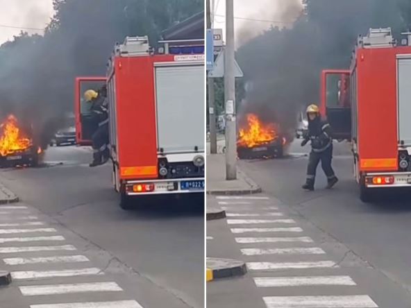 Na snimku se vidi vozilo koje se zapalilo kao i vatrogasci koji su brzo stigli na lice mesta i pokušavaju da ugase vatru.