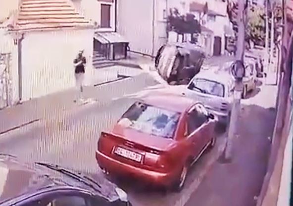 Čitava drama se dešava u uskoj, sporednoj ulici u kojoj su sa jedne strane parkirani automobili. Na snimku ne deluje da se automobil kretao velikom brzinom, pa je zato frapantno da se auto tako lako prevrnuo, a onda još i zapalio.
