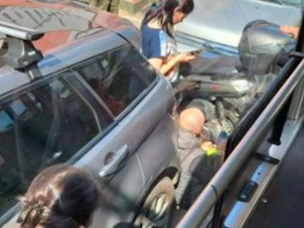 Tramvaji stoje za sad (u smeru ka centru). Vozač motora nije povređen, oštećen mu je samo kofer na motoru, ali sedi na zemlji. Takođe, hitna pomoć i policija su kod tramvajskih šina.