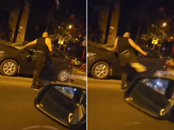 Društvenim mrežama kruži snimak muškarca koji usred noći na Karaburmi u Beogradu razbija staklo i šutira vrata jednog automobila. Visok, puniji muškarac, sa crnom majicom i tamnim pantalonama, šutira staklo kod vozača iz nepoznatog razloga.