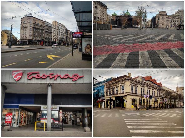 Kako se vidi na fotografijama, centar Beograda potpuno je pust. Na ulicama, koje su običnim danima uglavnom preplavljene vozilima, nalazi se po jedan automobil. Ljude je gotovo nemoguće sresti. Takođe je i manje autobusa na ulicama glavnog grada jer danas za gradski prevoz važi nedeljni red vožnje.