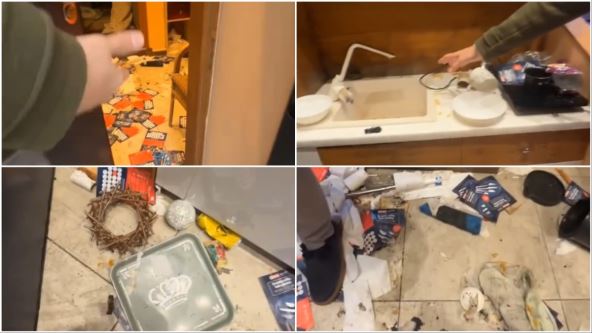 Na snimku se vidi sve - sudopera puna ostataka hrane, posuđe i papiri razbacani po podu, četke za ribanje uništene, a u tuš kabini jastuk! Spavaća soba izgleda kao da je prošao tornado - posteljina je svuda po podu, a zidovi su umazani na više mesta.