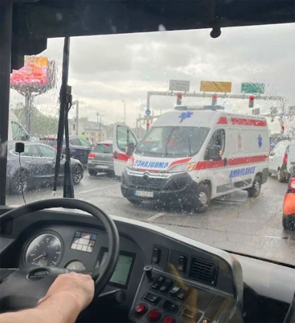 Kako se može videti na fotografiji napravljenoj iz vozila gradskog prevoza, ekipa Hitne pomoći trenutno ukazuje pomoć na mestu saobraćajne nezgode.