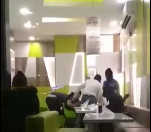 U jednom trenutku, jedna od njih tri je oborena na pod, dok druga nastavlja da je udara.