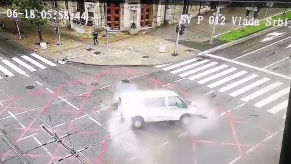 Na snimku se vide vozila koja su učestvovala u nesreći i koja velikom brzinom uleću na plato ispred Vlade Srbije.