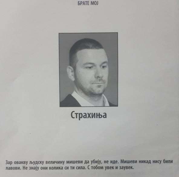 "Brate moj, zar ovakvu ljudsku veličinu miševi da ubiju, ne ide. Miševi nikad nisu bili lavovi. Ne znaju oni kolika si ti sila. S tobom uvek i zauvek, tvoj Petar", glasi čitulja Strahinjog brata, dok su porodično najavili da će sahrana Strahinje Stojanovića biti u sredu 16. septembra u 13.45 časova na Novom bežanijskom groblju, dok opelo počinje u 13.15 sati.
