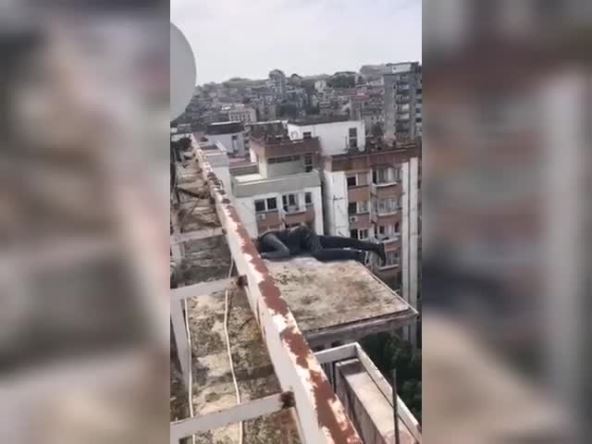 Kada je muškarac pao na terasu ispod, prisutni su vikali "dobro je, opusti se! Lezi dole".