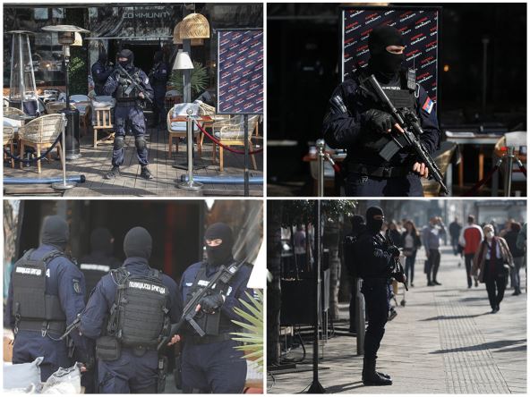 Specijaci sa maskama i dugim cevima vrše pretres objekta, a blokiran je i prolaz do "Kasine", dok brojne ekipe u klubu vrše pretres. Policija je u klub uvela i pse radi pretrage samog lokala.