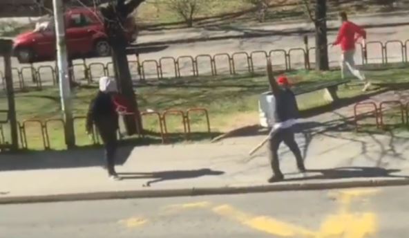 Kako pokazuje video materijal, muškarac sa kesom u ruci stoji kod autobuske stanice na uglu ulica Maksima Gorkog i Južnog bulevara, dok mu drugi muškarac sa palicom u ruci preti.