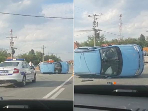 Od siline udara, jedan automobil se prevrnuo na stranu, a saobraćaj je otežan pošto vozila prolaze naizmenično.