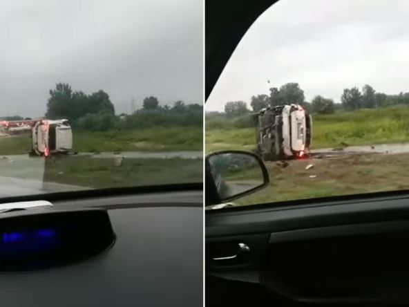 Vozač je belim terencem uleteo u kružni tok, udario u banderu, a zatim se prevrnuo.