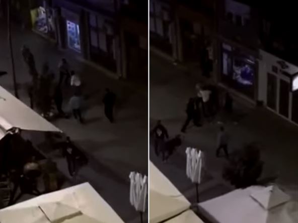 Na snimku koji su zabeležili građani vidi se kako se dva mušarca sukobljavaju i počinju da se udaraju, nakon čega još nekoliko njih ulazi u tuču i jedan muškarac pada na stakleni izlog koji se razbija. Iako su se zbog lomljave stakla u prvi mah malo razdvojili, tuča se onda opet nastavila, a činilo se da više muškaraca udara jednog.