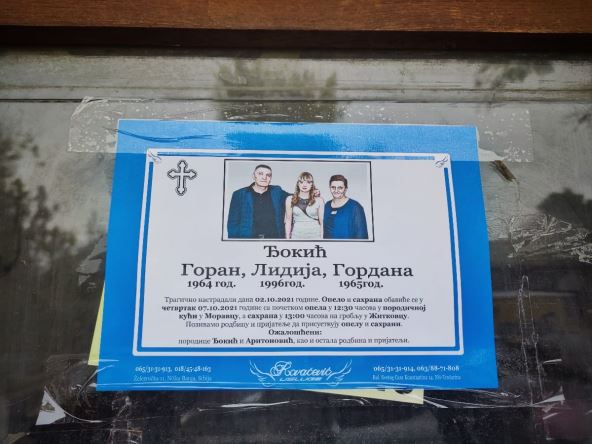 "Tragično nastradali dana 02.09.2021. godine. Opelo i sahrana obaviće se u četvrtak 07.09.2021. sa početkom opela u 12:30 časova u porodičnoj kući u Moravcu, a sahrana 13:00 časova na groblju u Žitkovcu. Pozivamo rodbinu i prijatelje da prisustvuju opelu i sahranu. Ožalošćeni: porodice Đokić i Aritonović, kao i ostala rodbina i prijatelji", piše na umrlici.