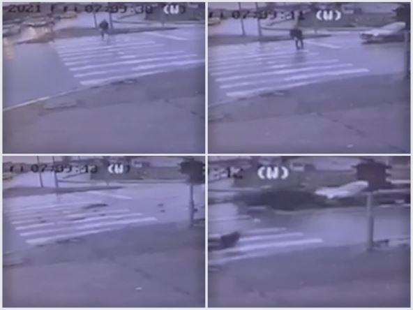 Na video snimku se vidi stravična saobraćajna nesreća u kojoj je jedna osoba koja je prelazila pešački prelaz na semaforu teško povređena, kada je na nju naletao automobil.