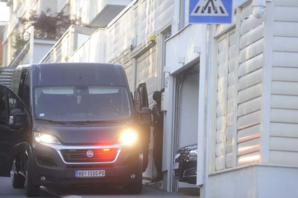 Darko Šarić nakon višesatnog pretresa izveden je iz vile na Dedinju u kojoj živi. Policijska "marica", sa uključenom rotacijom, se oko 18.30 sati približila ulazu u kuću, dok je drugi policijski džip uz nju.