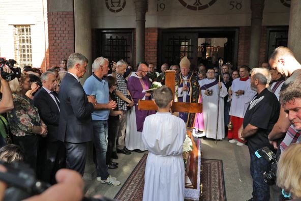"Braćo i sestre, da bismo Mateju iskazali poslednju počast, stojimo pored mrtvog tela. Verom koja traga, govorimo da ovo nije svršetak, jer naš Bog je Bog živih. Mrtvo telo odlazi, ostaje nam ime Mateja, koje sa poštovanjem izgovaramo. Bože, seti se njegovog imena, što si ga ti sam upisao u dlan svoje ruke", rekao je Hočevar i zamolio prisutne da se nakratko pomole u tišini za Mateja.