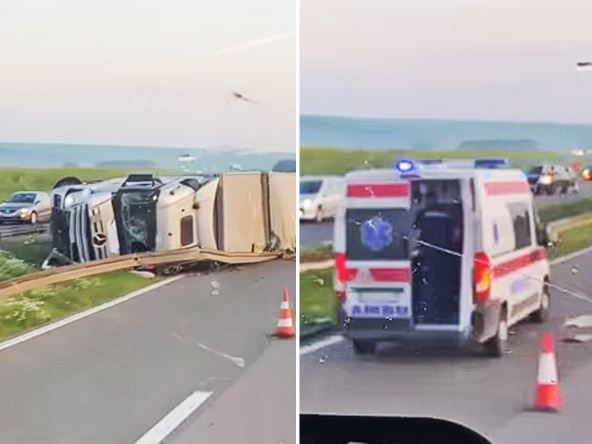 Vidi se kamion koji je prevrnut na bok nasred puta, a ispod njega se nazire motocikl. Kamion se prevrnuo na bankinu, a preticajna traka je zatvorena u oba smera i saobraćaj je otežan.