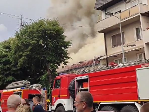Na snimcima se vidi crni gusti dim koji kulja iz objekta koji gori. Veliki broj policajaca i vatrogasaca se nalazi na licu mesta.