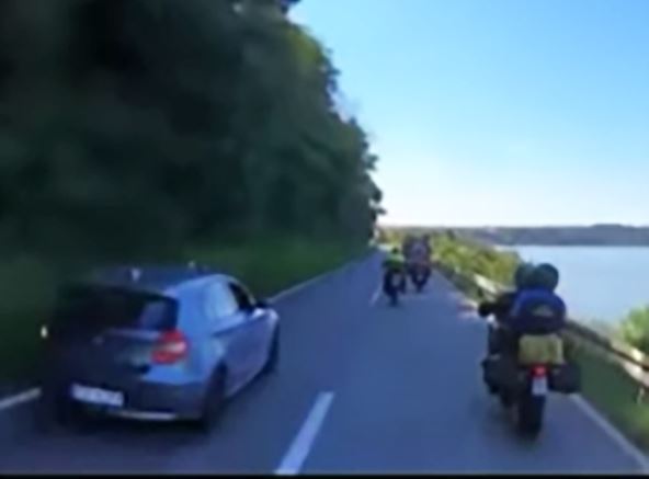 Kako se vidi na snimku, automobil je krenuo da pretiče više motocikala preko isprekidane linije, da bi ga sačekala puna linija, ali i krivina iz koje se pojavio automobil kojeg očito bahati vozač nije očekivao. Na svu sreću, taj vozač je prikočio i tragedija je izbegnuta.