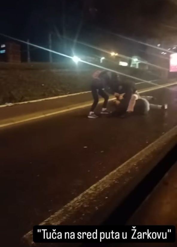 Pored njih se nalazi i ženska osoba koja pokušava da zaustavi tuču. Prema navodima sa društvenih mreža, do okršaja je došlo nasred puta u Žarkovu.