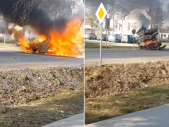 Nekoliko metara od automobila u plamenu vidi se prevrnuti traktor. Pretpostavlja se da su oba vozila učestvovala u udesu. Za sada nema informacija o povređenim licima, kao ni kako je došlo do nesreće.