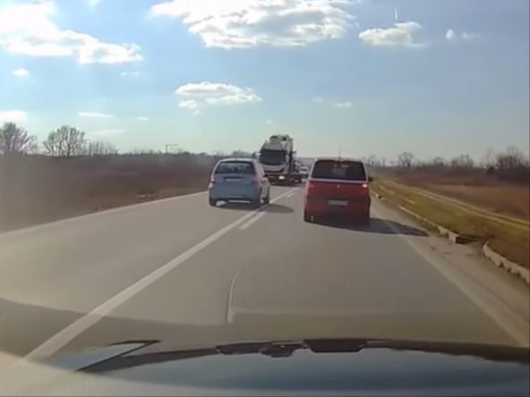 Vozač koji je u punoj brzini preticao automobil ispred sebe je preticao dok mu je u susret išao automobil. Na svu sreću uspeli su da se mimoiđu, ali je automobilu u suret stizao kamion. Za dlaku je uspeo da ga izbegne i da se vrati na put. Komentari ispod snimka su se samo nizali: