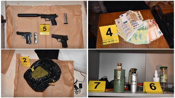 Policija u Beogradu, u saradnji sa Višim javnim tužilaštvom u Beogradu, uhapsila je P. M. (42) i J. B. (37) zbog neovlašćene proizvodnje i stavljanja u promet opojnih droga, dok se P. M. tereti i za nedozvoljenu proizvodnju, držanje, nošenje i promet oružja i eksplozivnih materija. Policija je pretresom stana i drugih prostorija P. M. pronašla oko 900 grama marihuane, 16 špriceva sa kanabisovim uljem, tri pištolja, prigušivač, dve bombe, više komada municije različitog kalibra, kao i 3.550 evra, tri mobilna telefona i vagicu za precizno merenje.