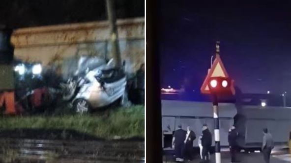 Kako se vidi na snimku, automobil je u potpunosti demoliran i zaglavljen je između bandere i voza. Mnogo meštana okupilo se na licu mesta.