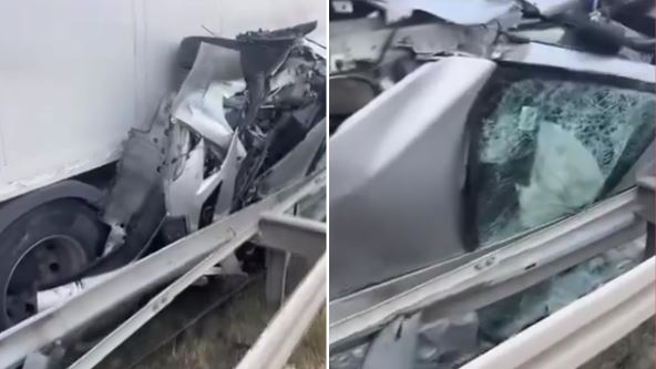 Automobil je završio na boku smrskan između bankine i kamiona. Na društvenim mrežama pojavio se snimak nakon sudara i automobil je u potpunosti smrskan.