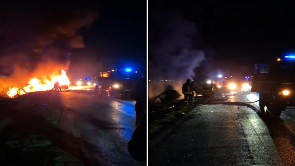 Kako se vidi na snimku i fotografiji, jedno vozilo je bilo u plamenu.