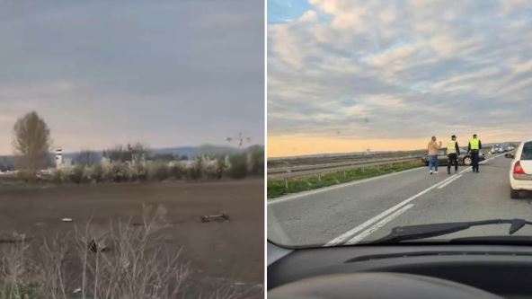 Na snimku se vidi da je automobil udario u bankinu. Preko puta, na njivi, vide se točkovi i drugi delovi automobila.